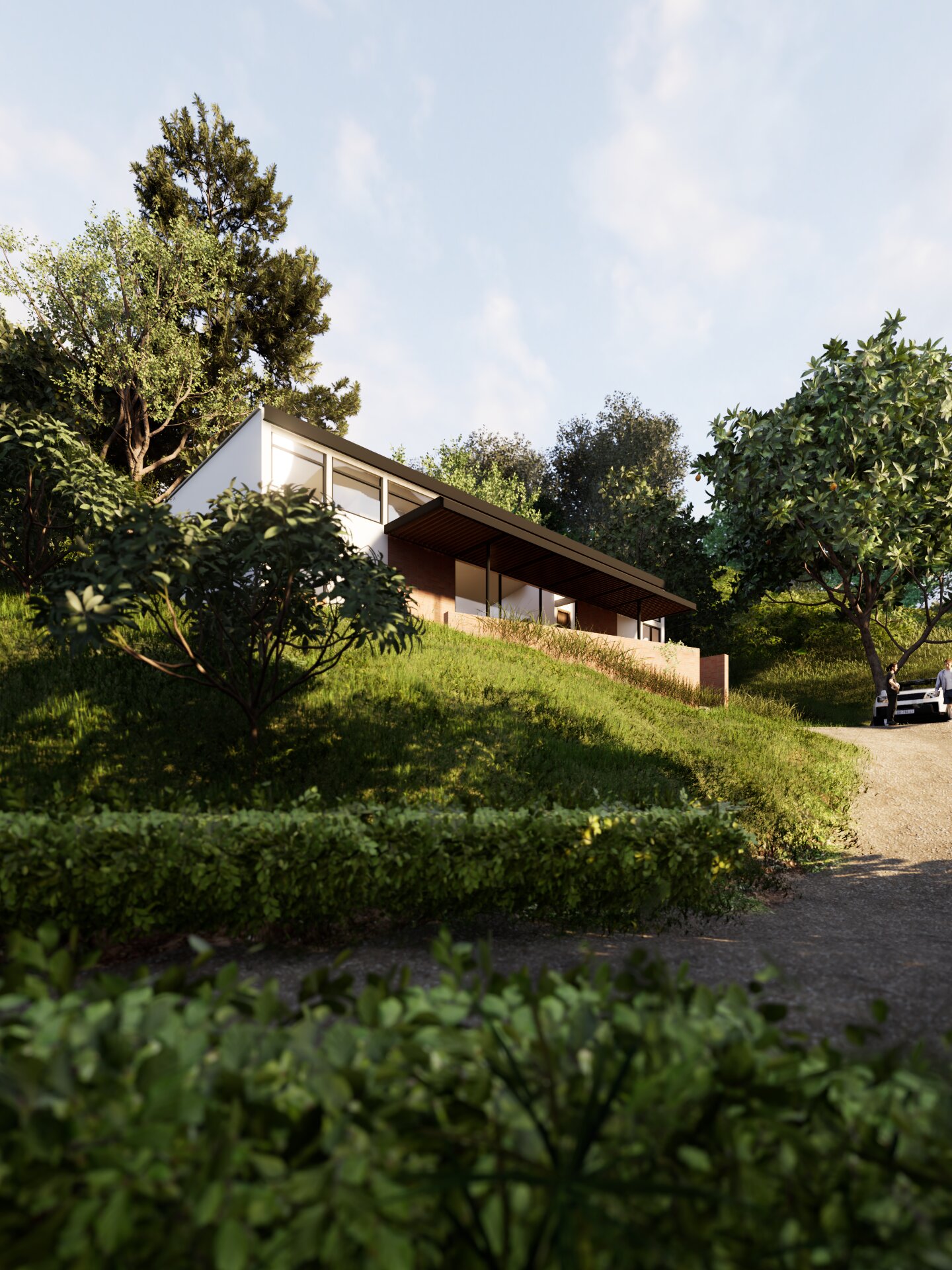 La propuesta se materializa como un volumen rectangular de geometría limpia y contenida, sobre el cual se incorpora una pérgola que protege la edificación de la incidencia solar del sur durante la mayor parte del año, aportando control climático y sombra a los espacios interiores.