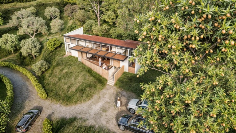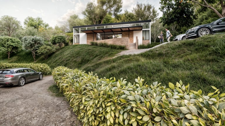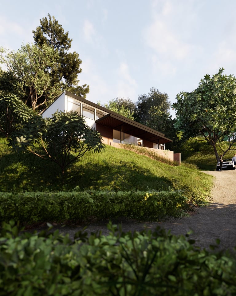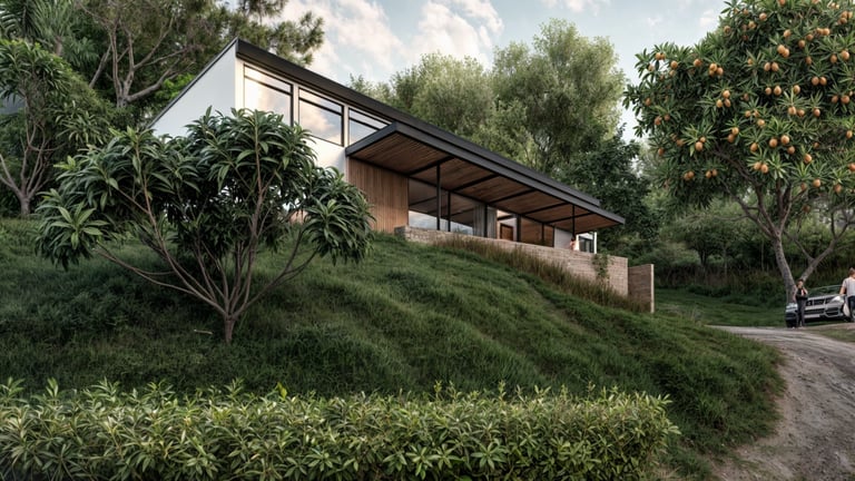 Cabaña 84 corresponde al diseño de una vivienda de 120 m² con tres habitaciones, implantada en un punto intermedio de una ladera, donde la arquitectura se adapta a la topografía mediante un pequeño volumen–plataforma que resuelve el acceso y la relación inicial con el terreno.