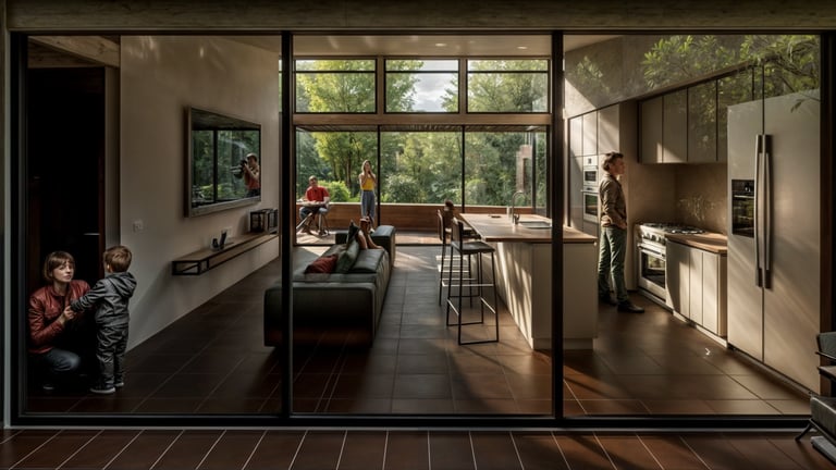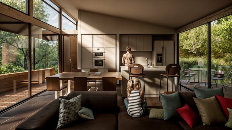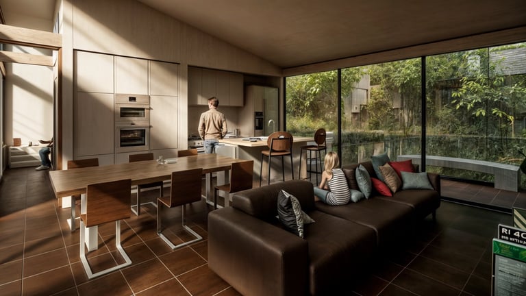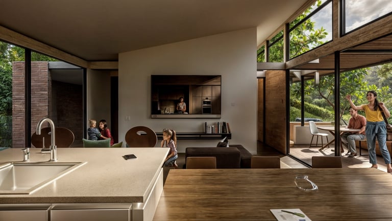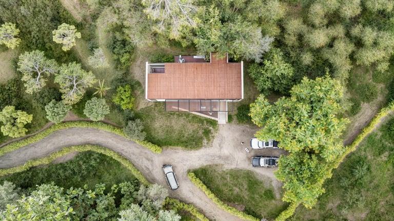 Este espacio central se abre mediante grandes ventanales que buscan maximizar la ventilación natural y favorecer el refrescamiento interior, reforzando la relación directa entre la arquitectura y el entorno. El resultado es una vivienda clara y eficiente, donde la implantación, la orientación y la distribución espacial trabajan de manera conjunta para responder al clima, la topografía y la vida cotidiana.
