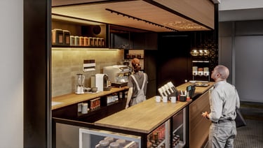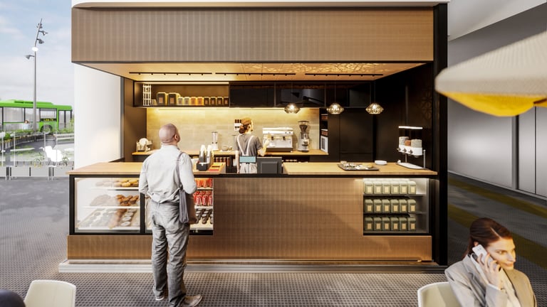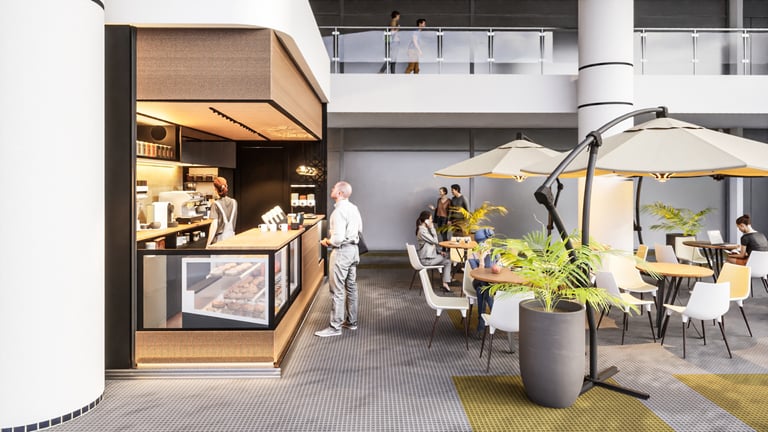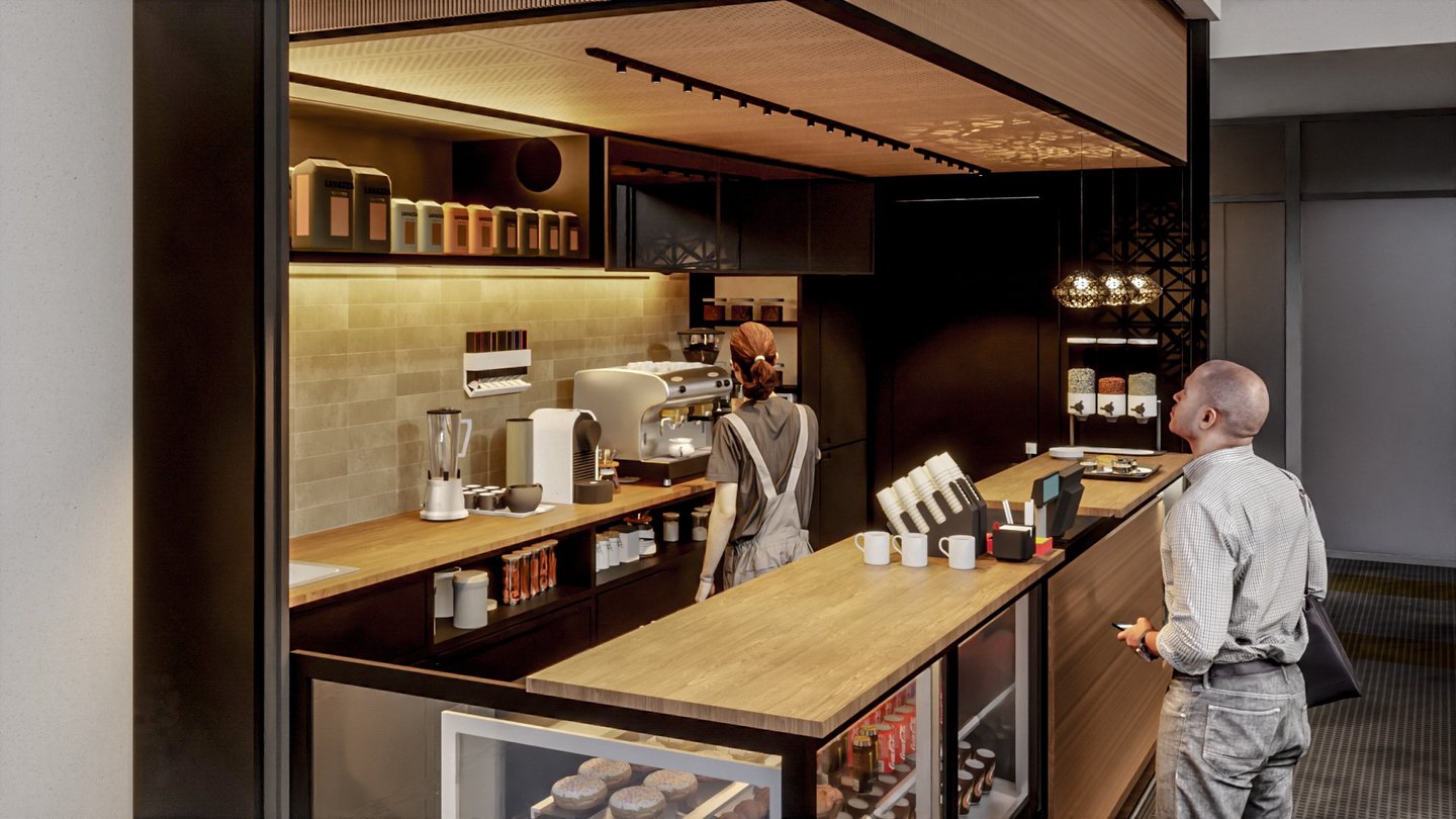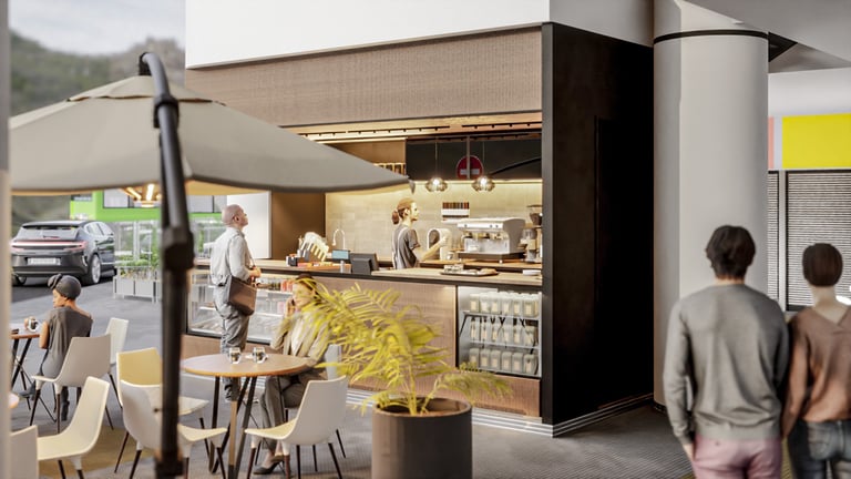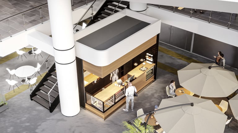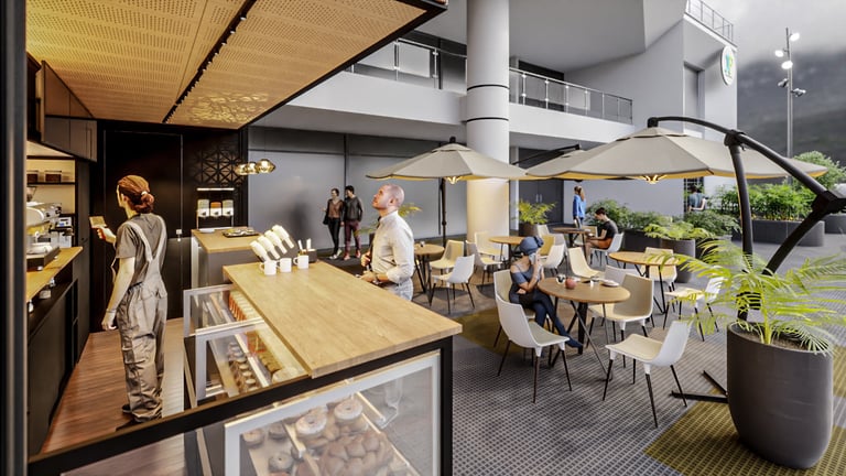 El volumen alberga un área cerrada de mesas, acompañada por iluminación integrada y vegetación interior, con el objetivo de activar el atrio y generar un espacio de permanencia dentro de un vacío arquitectónico preexistente. El proyecto se concibe como un ejercicio de exploración espacial y programática, orientado a la disposición de una panadería, productos de café local y un punto de café de barismo especializado.