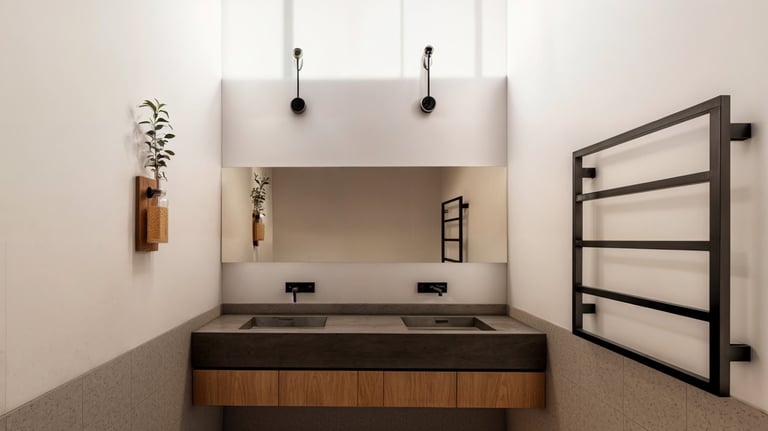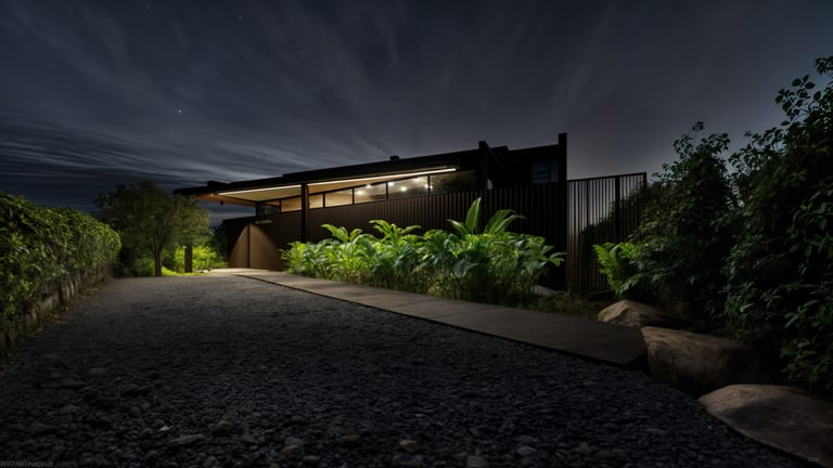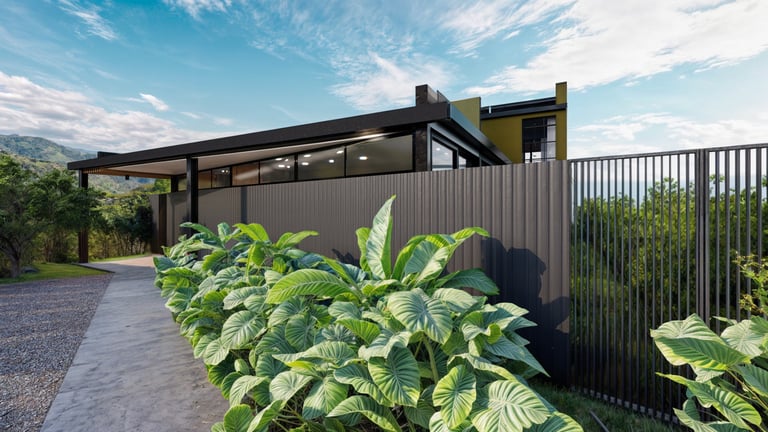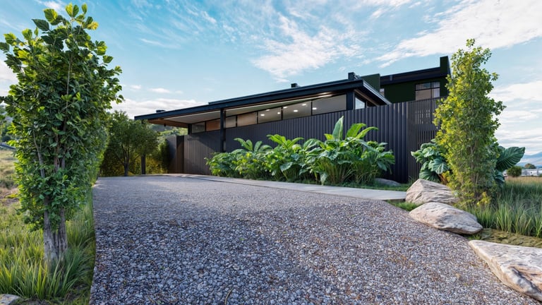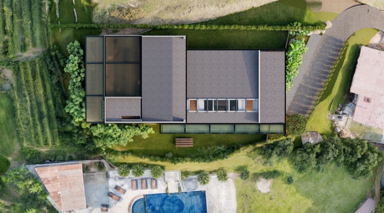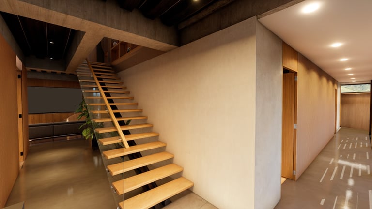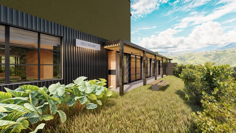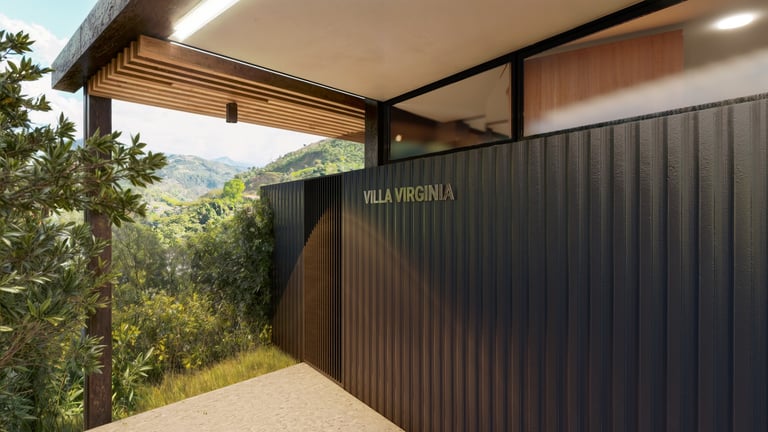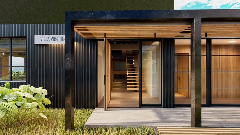 El lenguaje arquitectónico, tanto exterior como interior, se define desde una estética industrial sobria, mediante el uso de concreto, acero y madera como materiales predominantes. Hacia los laterales y el acceso, el proyecto mantiene un concepto de alta privacidad, sin perder la relación con el espacio abierto, incorporando jardines contenidos dentro de los linderos que actúan como filtros visuales y espaciales.