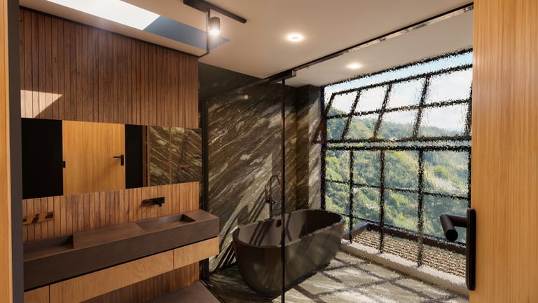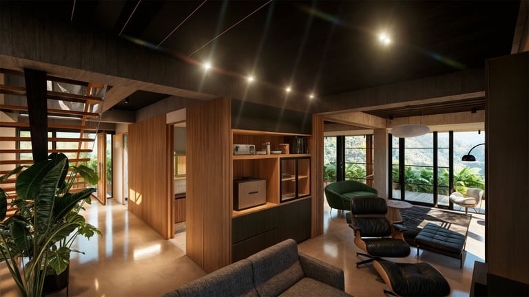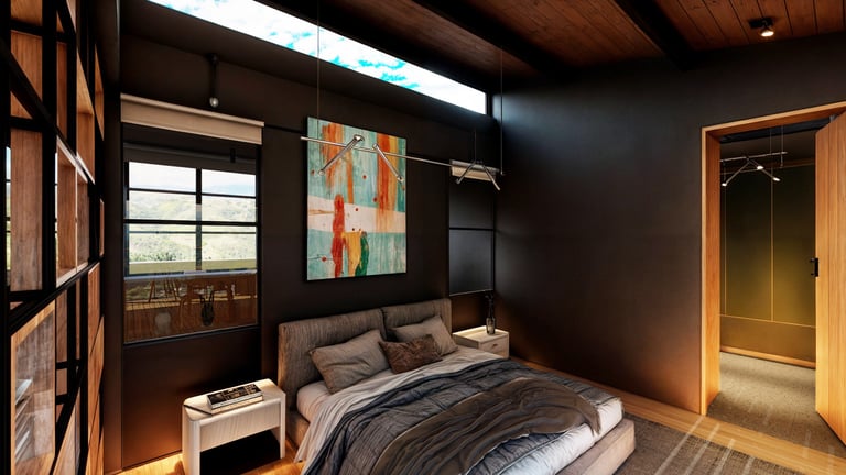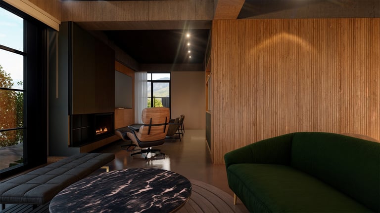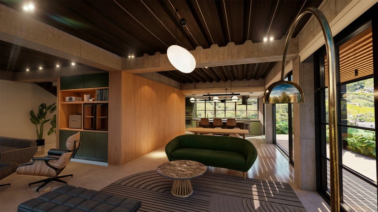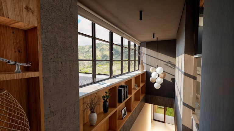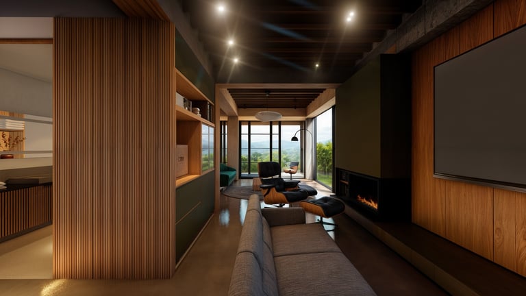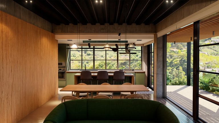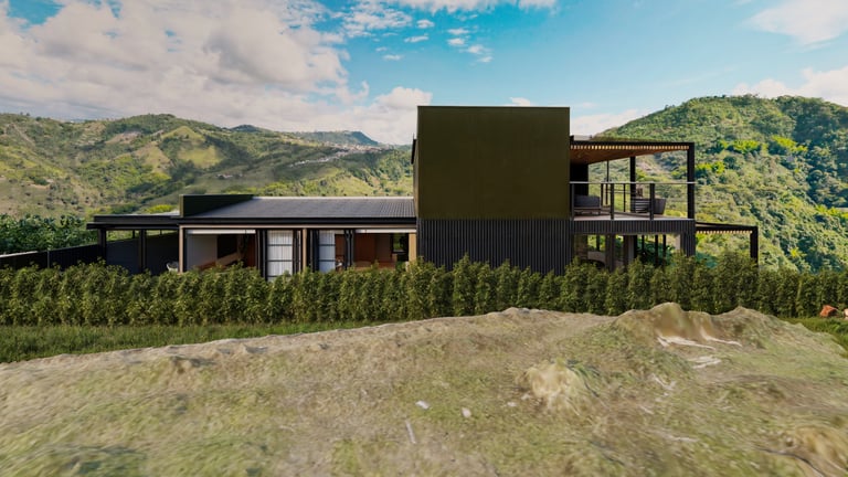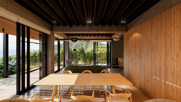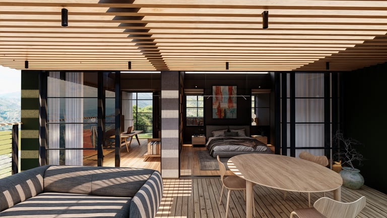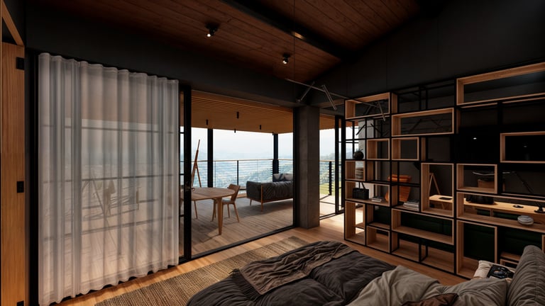 El área social se sitúa en este punto privilegiado, configurándose como un espacio amplio y continuo que se abre completamente hacia el paisaje y permite disfrutar de la visual y del atardecer. En esta misma dirección se ubica la habitación principal, concebida como un espacio completo y confortable, con una relación directa y permanente con el entorno natural.