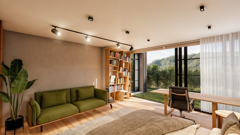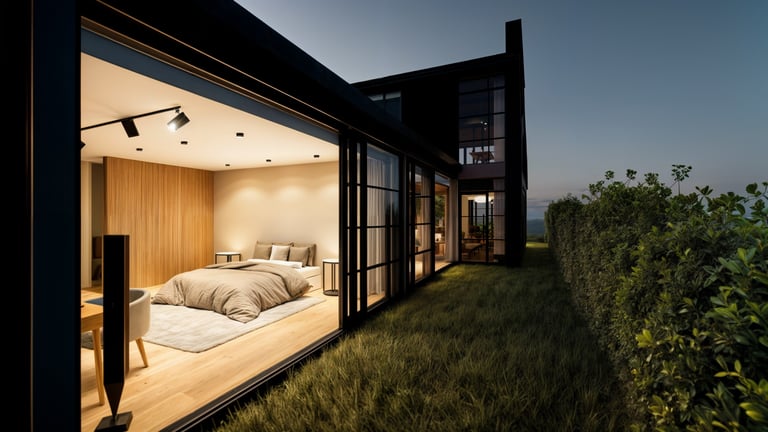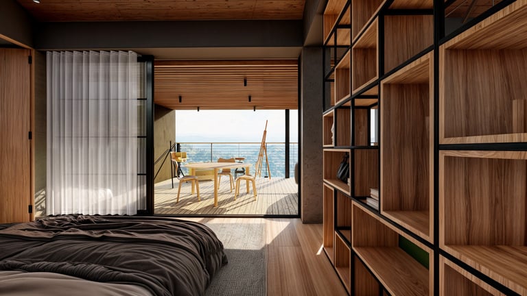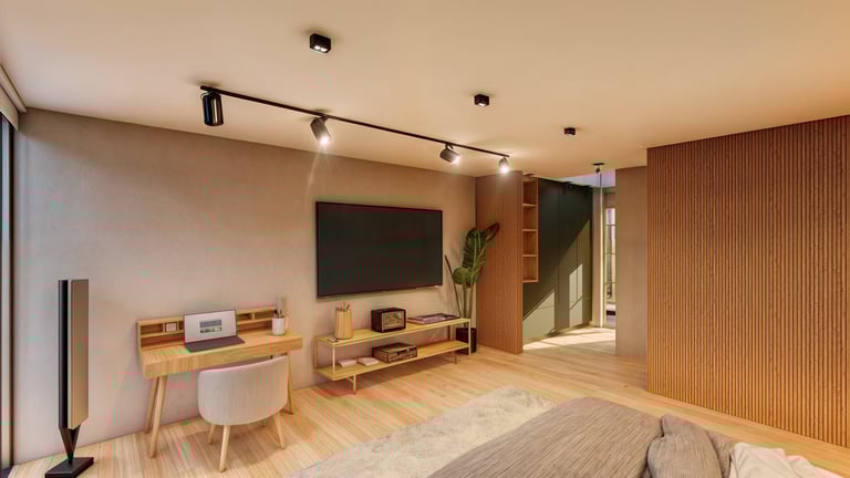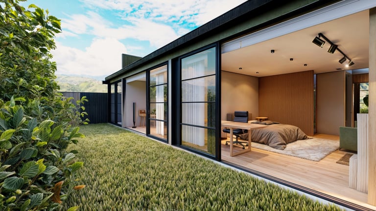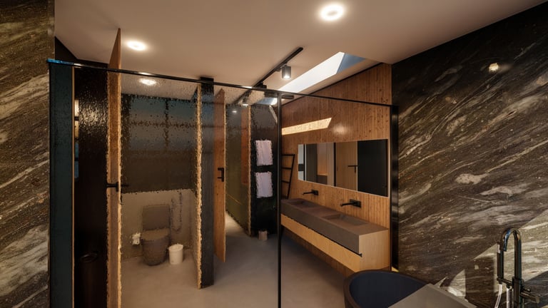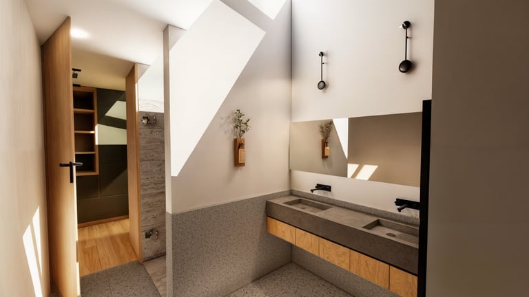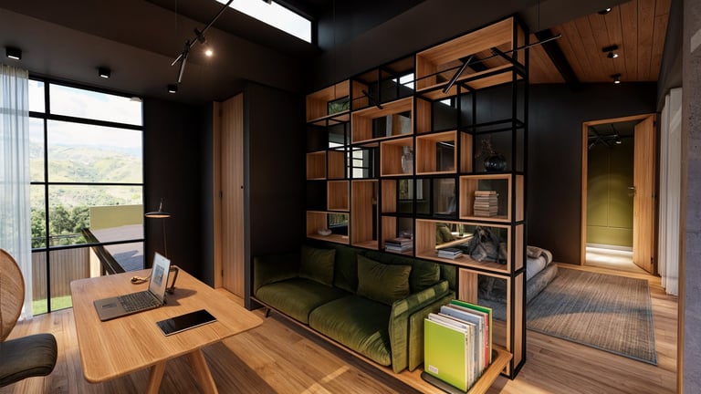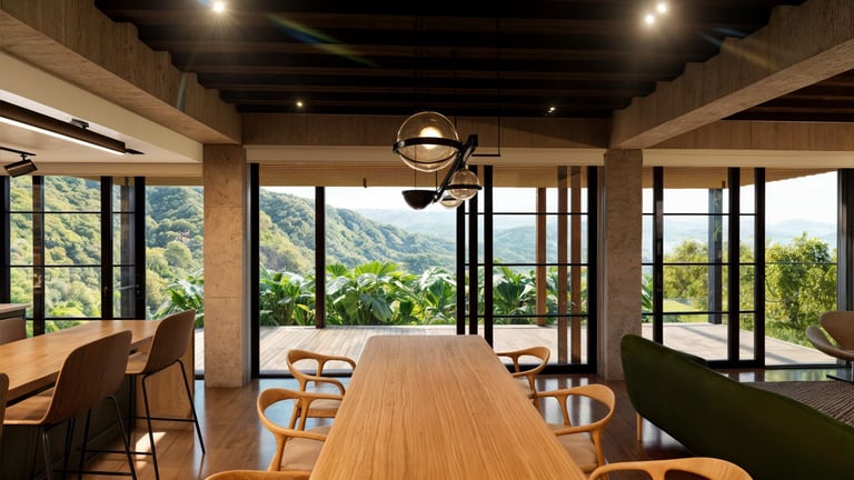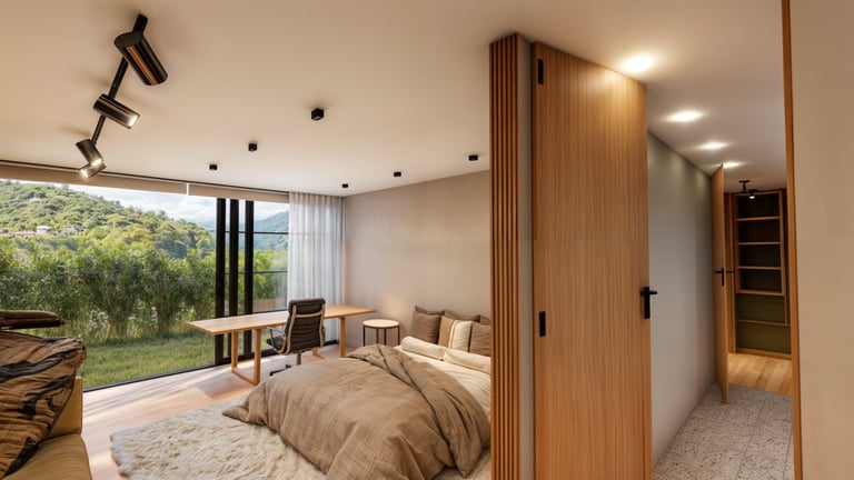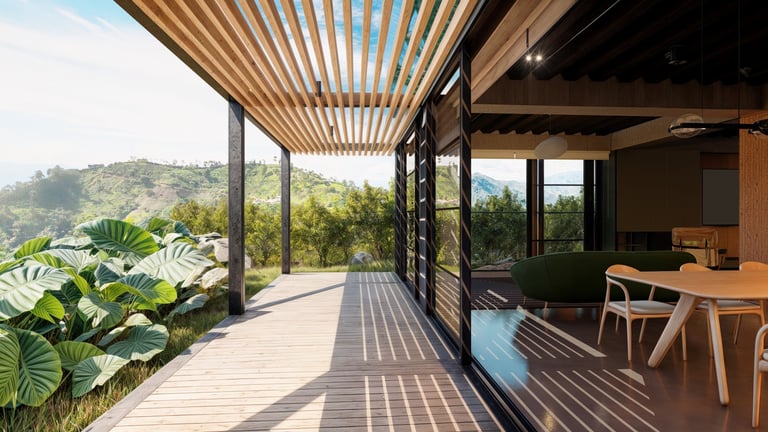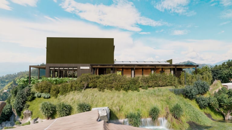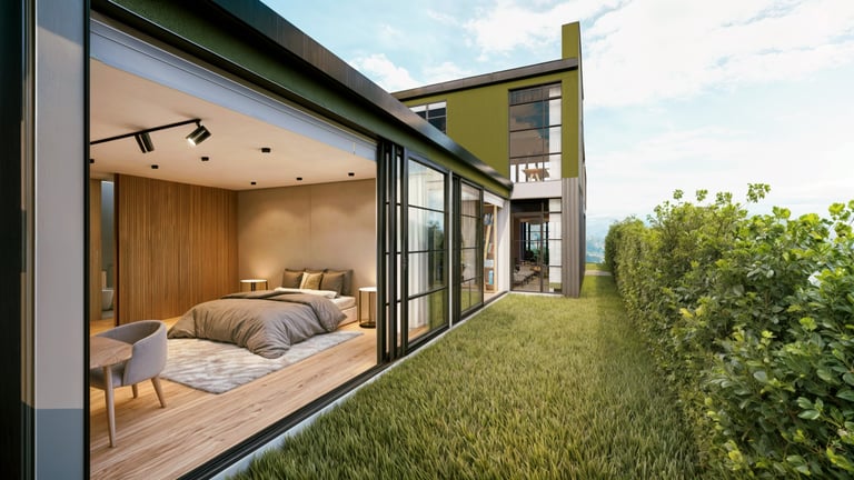 El área social se sitúa en este punto privilegiado, configurándose como un espacio amplio y continuo que se abre completamente hacia el paisaje y permite disfrutar de la visual y del atardecer. En esta misma dirección se ubica la habitación principal, concebida como un espacio completo y confortable, con una relación directa y permanente con el entorno natural.
