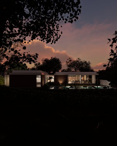 Residencia unifamiliar de gran escala, ubicada en un condominio en Cerritos, desarrollada en un solo nivel sobre una ladera de pendiente suave. El proyecto se concibe como una composición horizontal de planos de piso, cerramiento y cubierta que flotan sobre el paisaje, abriéndose completamente hacia el entorno natural.