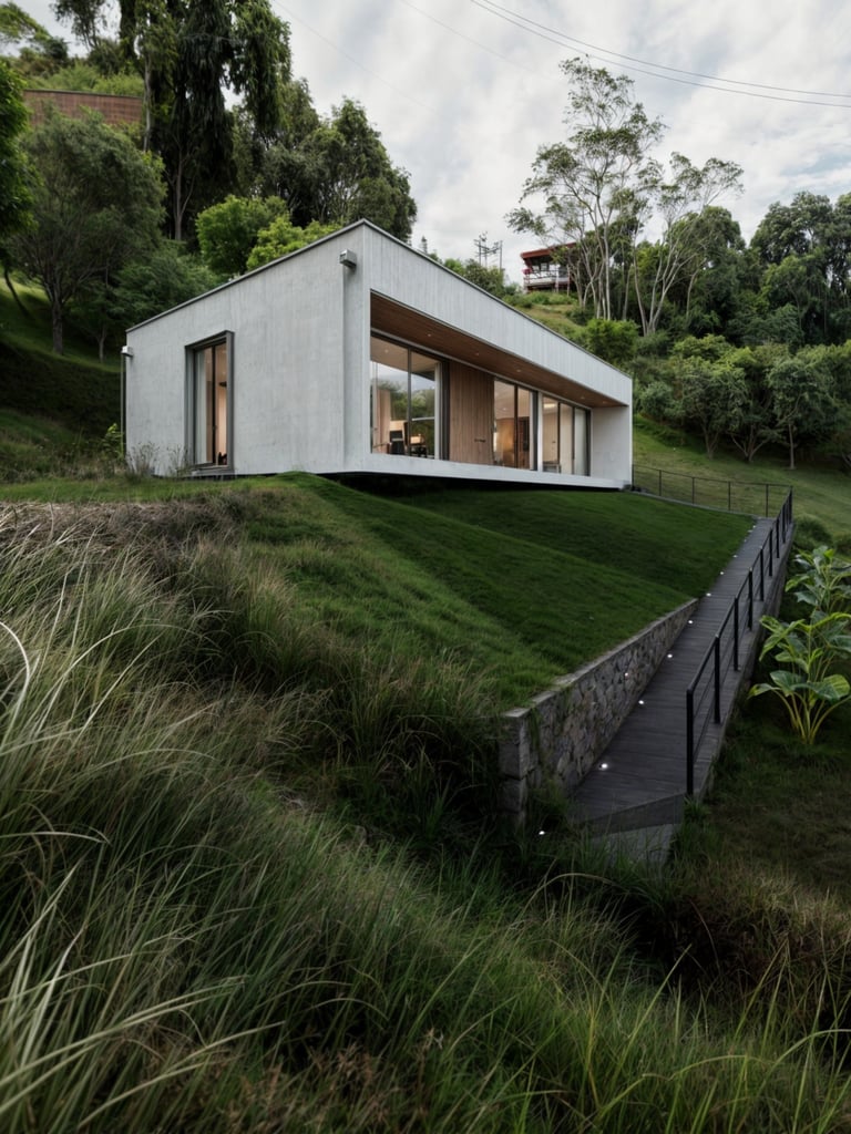 Casa 34 es una vivienda unifamiliar de 150 m² ubicada en la vereda La Cabaña, Manizales, dentro del condominio Pueblo Nuevo. El proyecto se implanta sobre una plataforma que retiene el terreno en pendiente y funciona como rampa de acceso desde el nivel inferior. La arquitectura se plantea como un volumen simple y contenido, que se abre al paisaje y se posa sobre la ladera con una expresión minimalista y precisa.