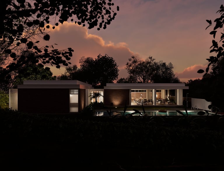 Vivienda unifamiliar de tres alcobas ubicada en la cima de una montaña en la ciudad de Manizales, implantada sobre un lote de proporción estrecha. El proyecto adopta un lenguaje industrial contemporáneo, utilizando concreto, acero y madera como materiales principales. La organización espacial prioriza las visuales hacia el fondo del lote, donde se concentran el área social y la habitación principal, estableciendo una relación directa con el paisaje y el atardecer, mientras que los laterales y el acceso se resuelven desde un criterio de alta privacidad y control espacial.